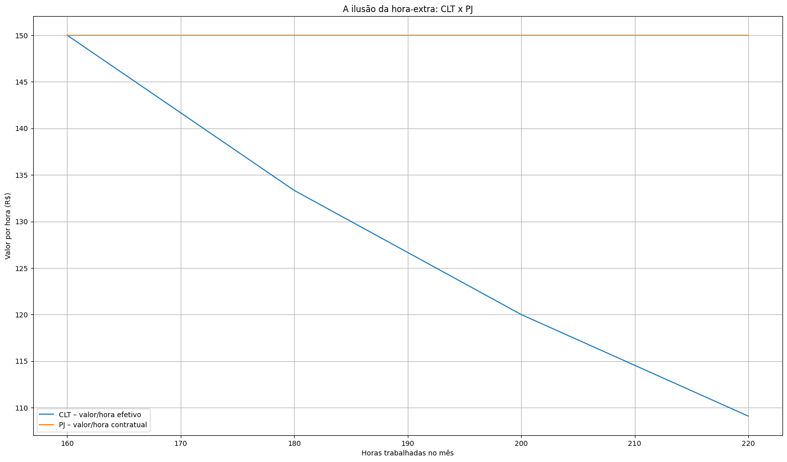Até aqui, tudo parece fazer sentido. Até que não. O problema surge quando a carga de trabalho aumenta. Se esse mesmo profissional trabalha 200 horas no mês, seja por pressão do projeto, picos de demanda ou acordos de banco de horas, o custo total pago pela empresa não muda. O salário líquido continua o mesmo, os benefícios continuam os mesmos.